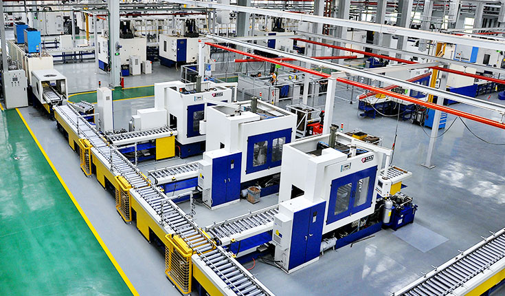 殼體加工自動(dòng)線,產(chǎn)品合格率99.9999999%這是由5條先進(jìn)的生產(chǎn)線組成的智能加工組,實(shí)施在線檢測(cè),保證產(chǎn)品的精準(zhǔn)度,保障產(chǎn)品質(zhì)量。小車(chē)自動(dòng)將上好料的托盤(pán)運(yùn)送到機(jī)床內(nèi)加工完成并送到下料工位,產(chǎn)品加工完后經(jīng)兩條自動(dòng)物流線自動(dòng)運(yùn)輸,經(jīng)過(guò)清洗機(jī)清洗,通過(guò)檢漏機(jī)檢漏后下線。產(chǎn)品合格率達(dá)到了99.9999999%。